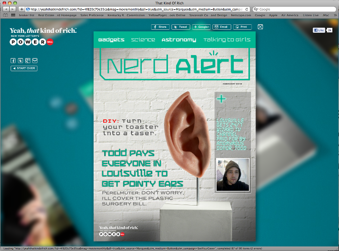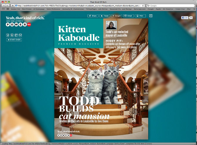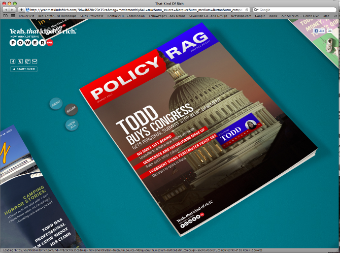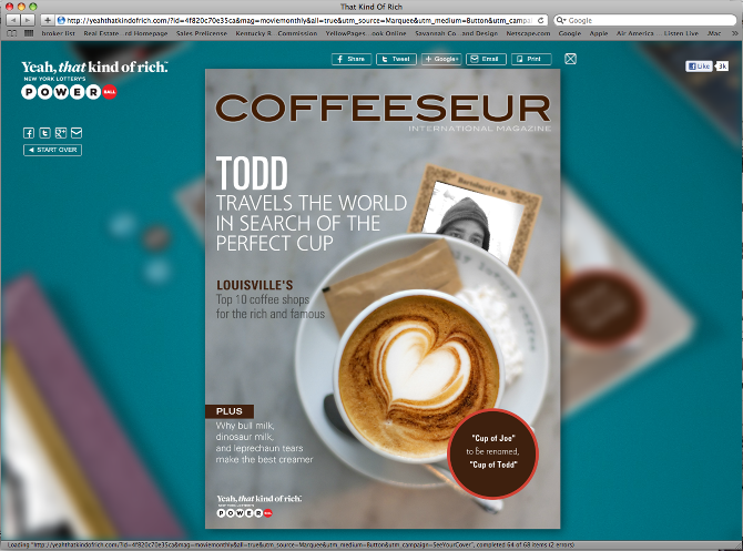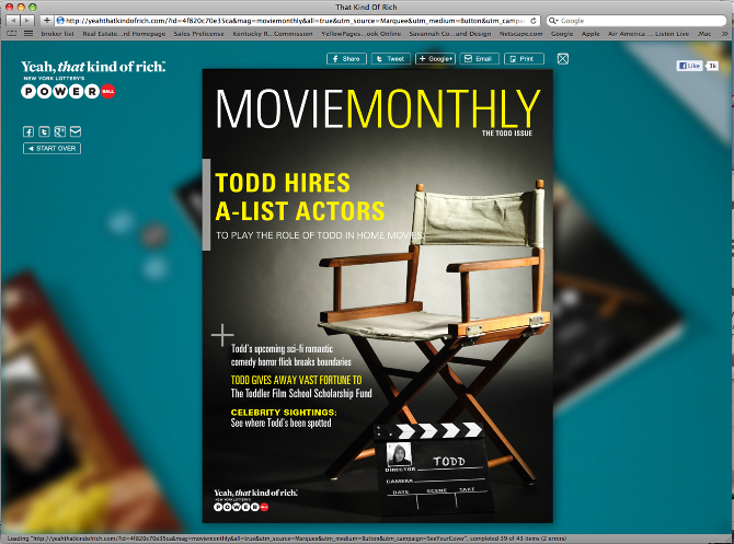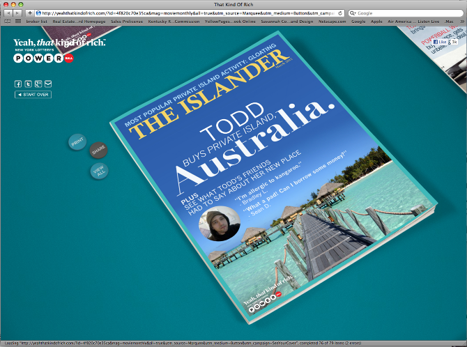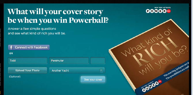 Based on Facebook Likes and profile information, this Facebook app automatically generates custom magazine covers with headlines predicting what your life could be like as a lottery winner.